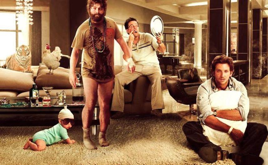 Zach Galifianakis, Ed Helms, Bradley Cooper, a baby, and a chicken wake up in a Caesars Palace suite that never existed. (Image: Warner Bros.)