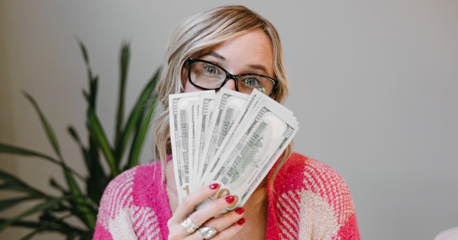 woman holding up money